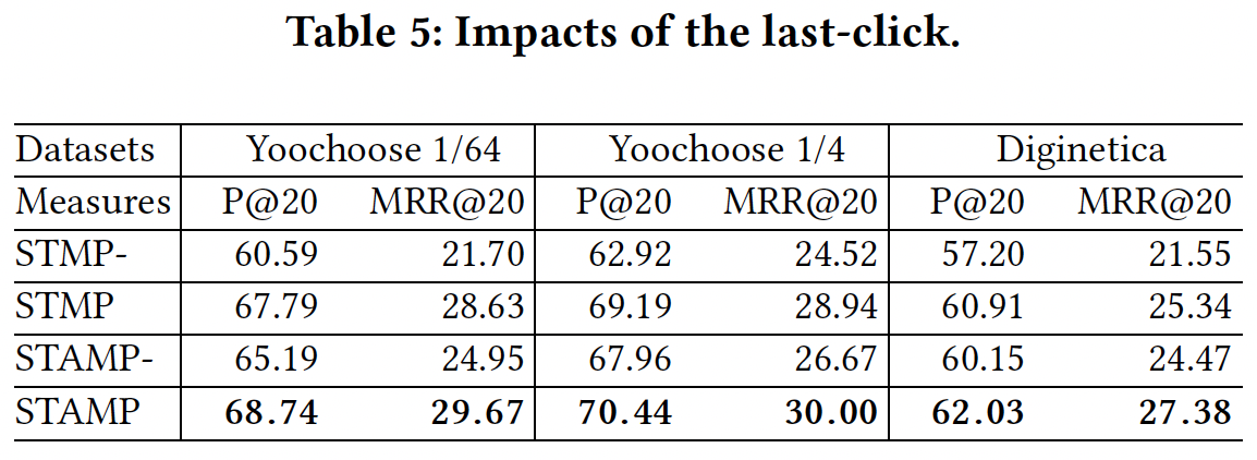 此外,STAMP- 优于 STMP-,这是由于 STAMP- 中的注意力机制捕获了混合兴趣(hybrid interest),而 STMP- 仅考虑一般兴趣。这表明 last lick 信息在 session-based 推荐任务中的重要性。
