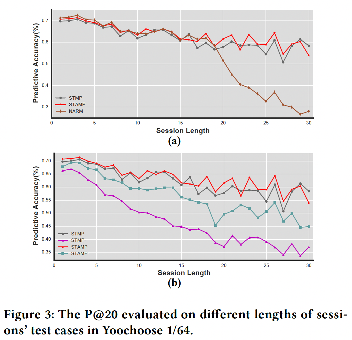 我们首先展示了在 STMP, STAMP, NARM 上不同 session 长度的实验结果,如图 (a) 所示。可以看到,当 session 长度超过 20 时,和 STMP 与 STAMP 形成鲜明对比,NARM 的性能迅速下降。这表明 short-term interests priority based 的模型在处理 long session 方面可能比 NARM 更强大。