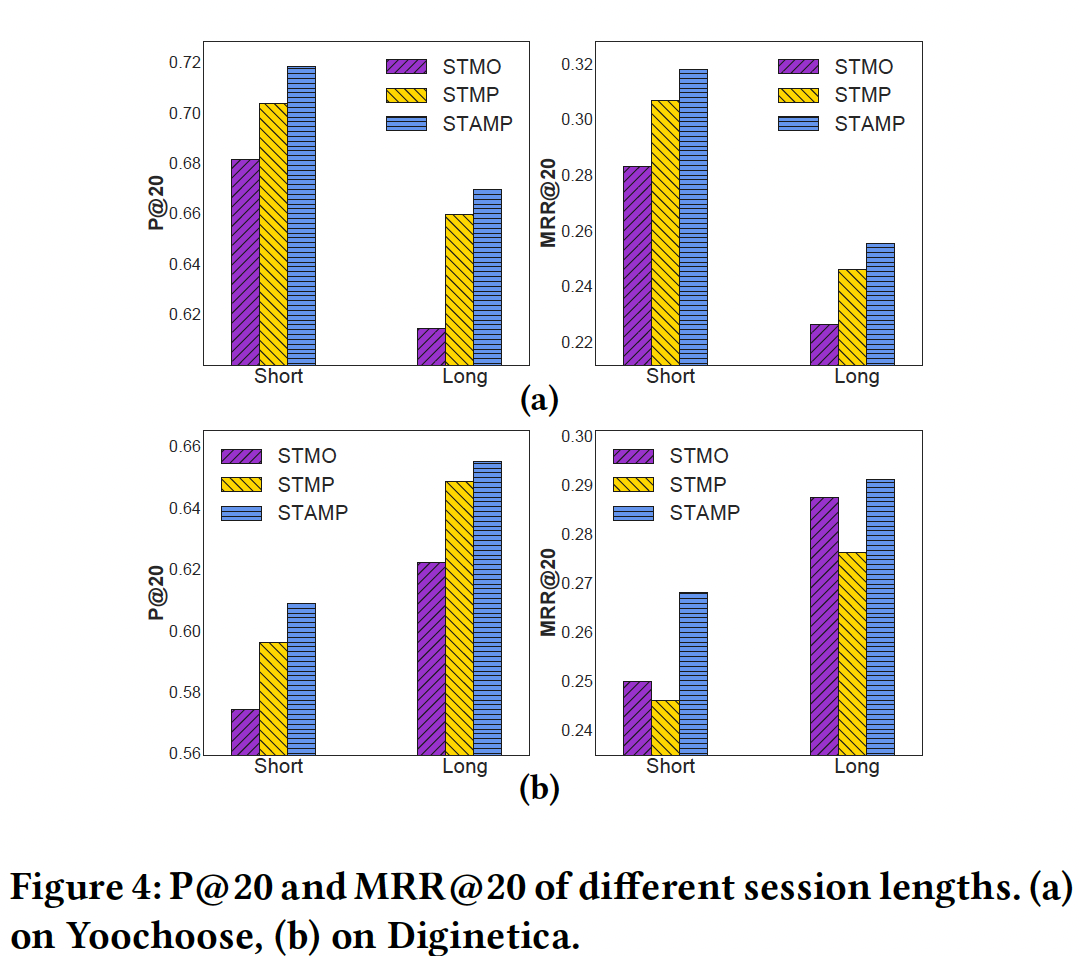 此外,STMP 和 STAMP 在两组中的表现都优于 STMO,并且随着 session 长度的增加,gap 变得更大。这意味着考虑一般兴趣和当前兴趣的模型(相比较于仅使用 last click 信息的模型)在处理 long session 时可能更强大。