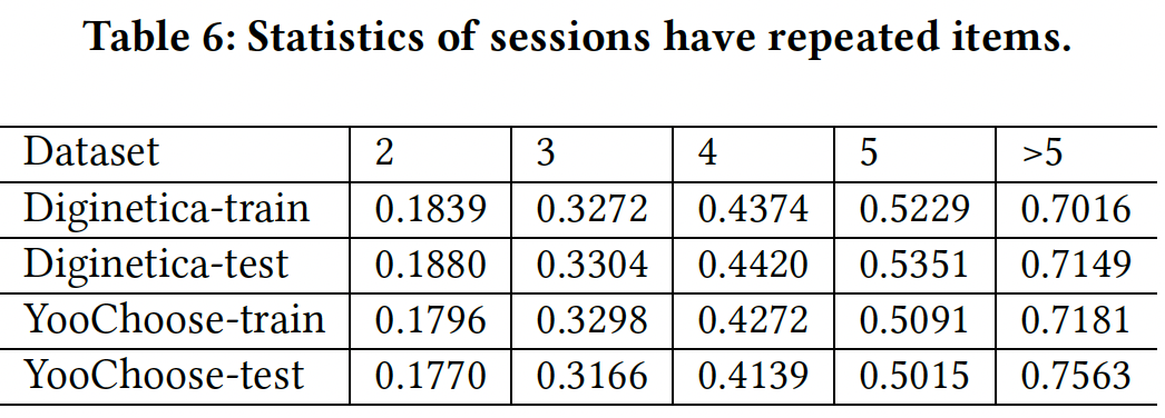 从下表可以看到:Yoochoose 中重复点击的 session 占比相比 Diginetica 数据集,在 Short 组中的占比更小、在 Long 组中的占比更大。