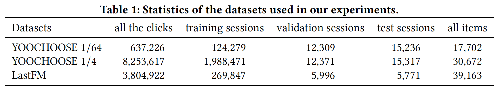 YOOCHOOSE 1/64 数据集包含 17702 个 item 的 637226 次点击,随机分为 124279 个训练 session、12309 个验证 session、以及 15236 个测试 session 。