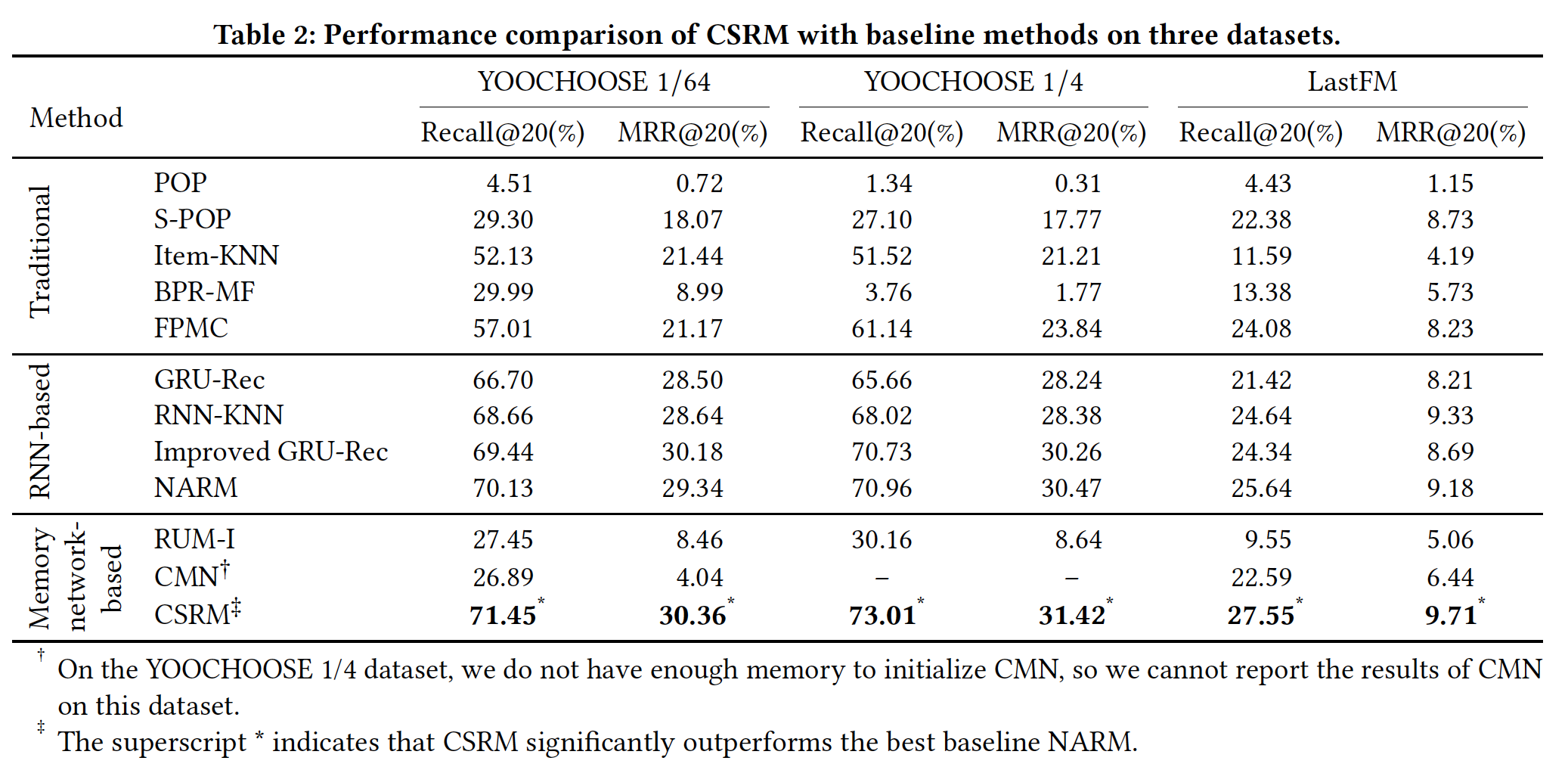 对于 MANN-based 方法,我们发现 CSRM 在所有数据集上都优于 RUM 和 CMN。这是因为在 session-based 推荐中没有可用的用户信息,并且 RUM 和 CMN 在这种 case 中根本不适用、也没有效果。