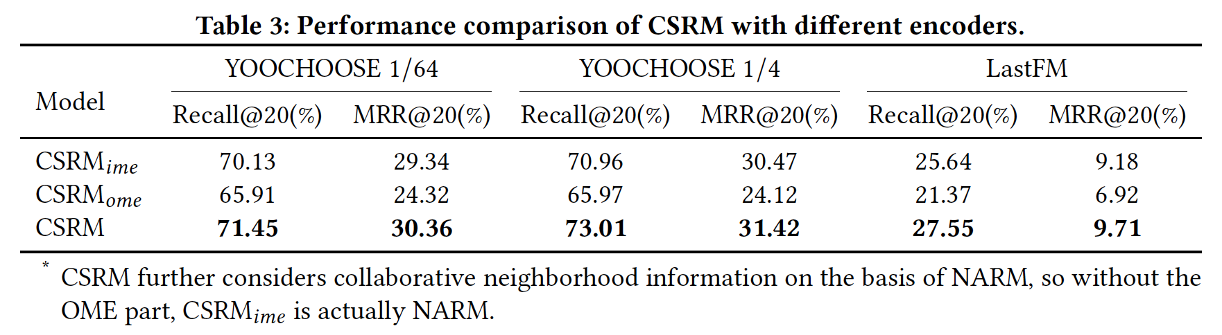 OME 的 CSRM。它使用 RNN 的固有 memory 来建模当前 session 中的序列行为。它实际上相当于 NARM 模型,因为 CSRM 在 NARM 的基础上进一步考虑了collaborative neighborhood information。在本节中,我们使用 NARM 的结果来表示