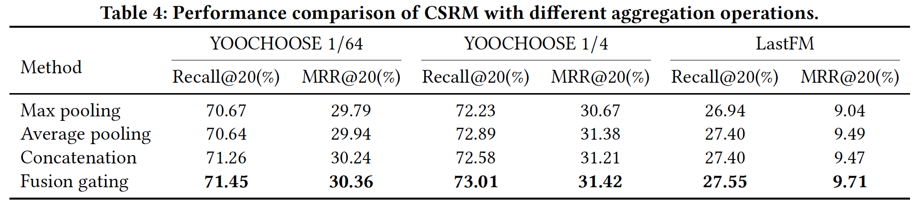 聚合操作的影响(RQ3):接下来,我们带不同聚合操作的 CSRM 进行相互比较。这些聚合操作包括:最大池化、均值池化、拼接、融合门控机制。