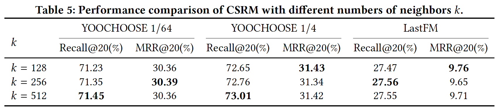 邻居数量的影响(RQ4):为了研究collaborative neighborhood information对 session-based 推荐的影响,我们在下表中展示了 CSRM 关于不同邻居数量的性能。