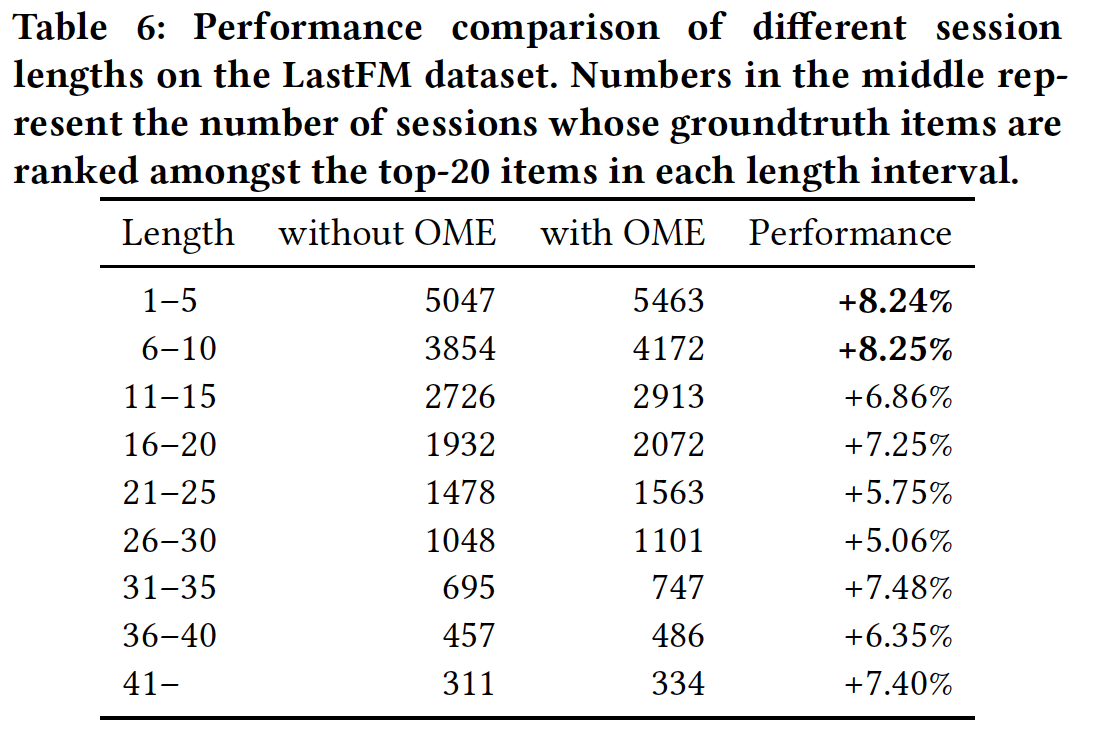 一般而言,session 长度在 1 到 10 之间时,CSRM 的性能提升更强。这可能是因为当 session 很短时,每个 session 的点击 item 有限,因此很难捕获 session 的意图。在这种情况下,CSRM 擅长通过collaborative neighborhood information来捕获 session 的意图。