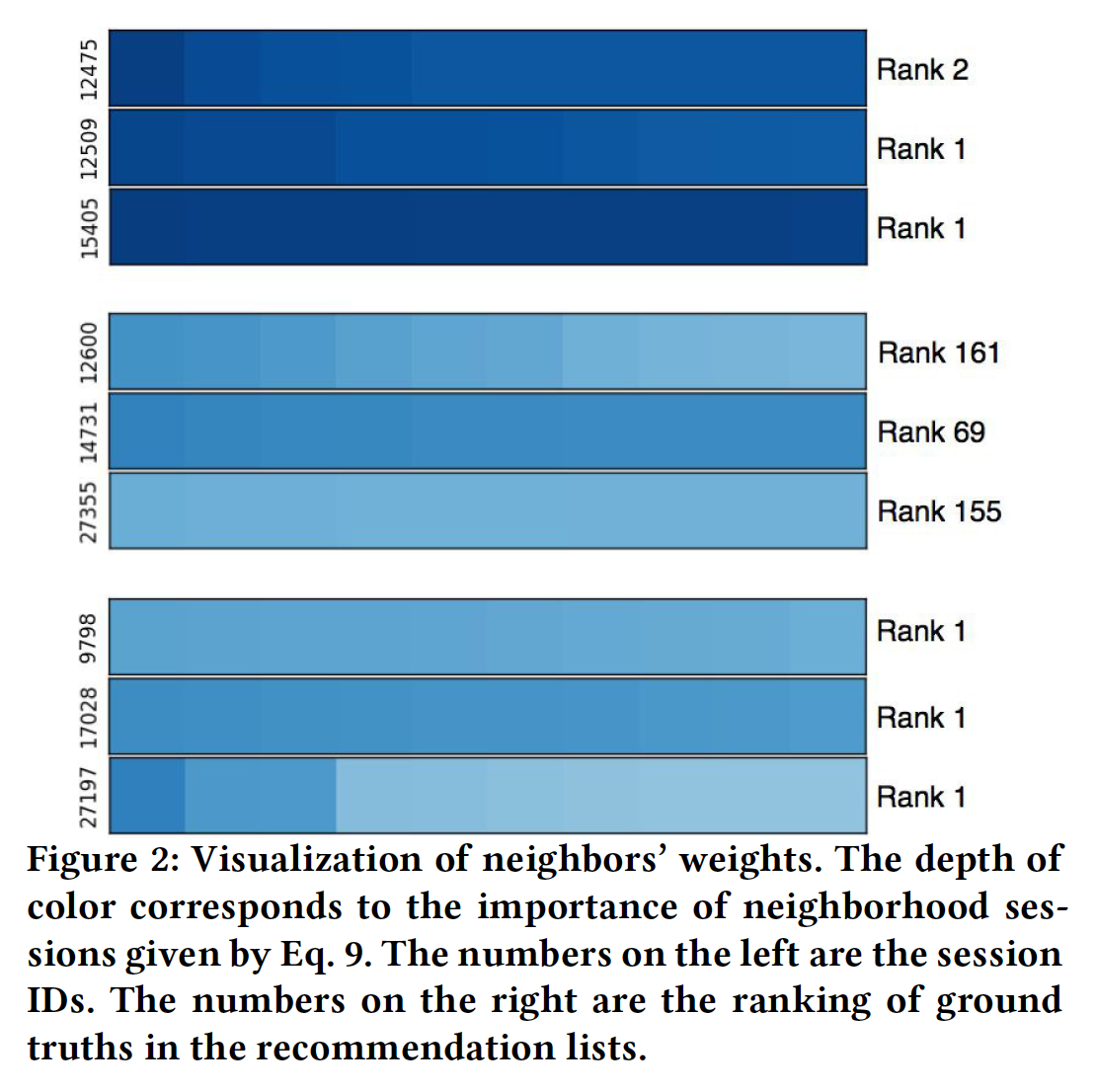 总体而言,显然具有高度相似neighbor 的 session 获得了更好的推荐性能,即下图中的 session 12475, 12509, 15405 。