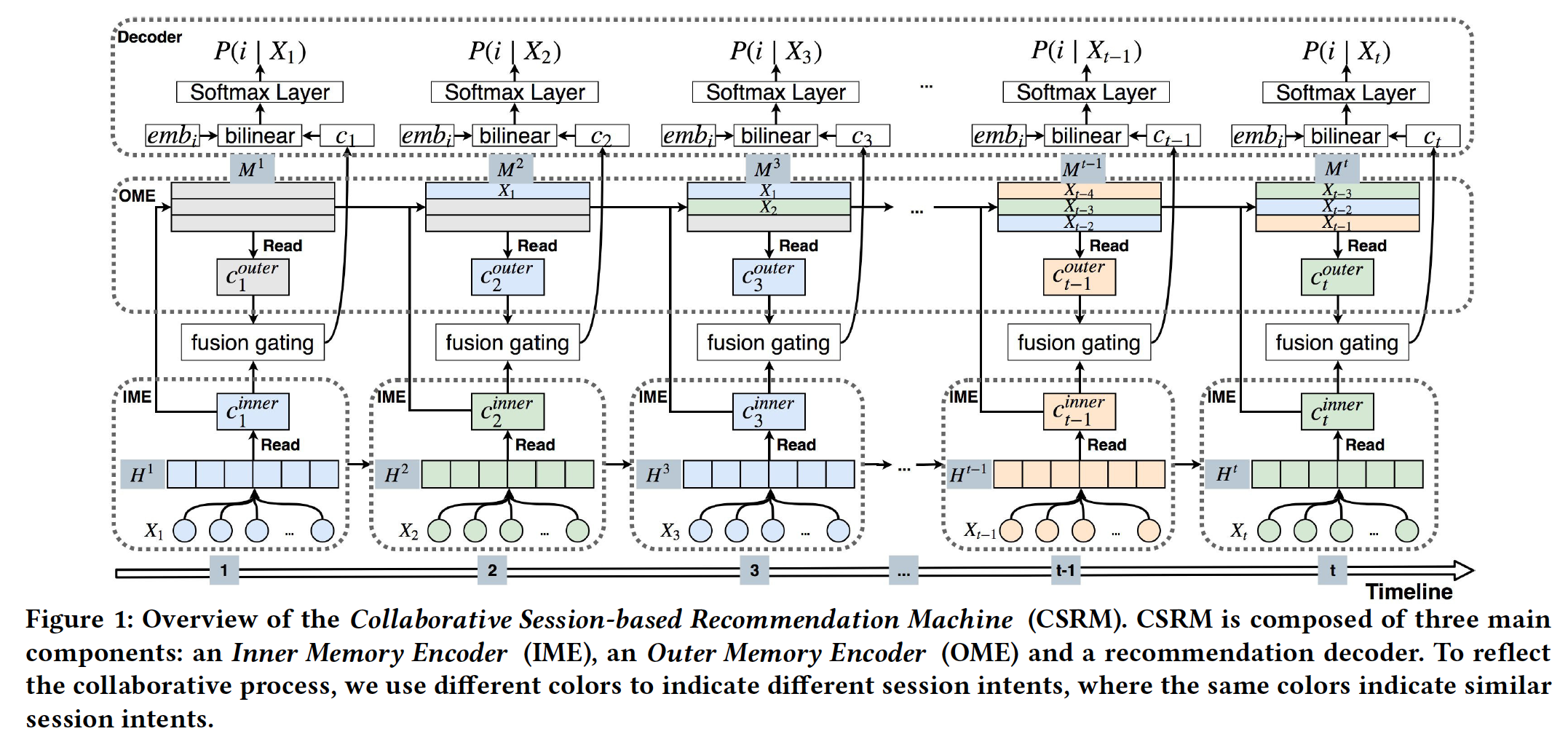 如下图所示,CSRM 由三个主要组件组成:一个 Inner Memory Encoder: IME、一个 Outer Memory Encoder: OME、一个推荐解码器(recommendation decoder)。融合门控机制(fusion gating mechanism)用于控制 IME 和 OME 组件之间的信息流。