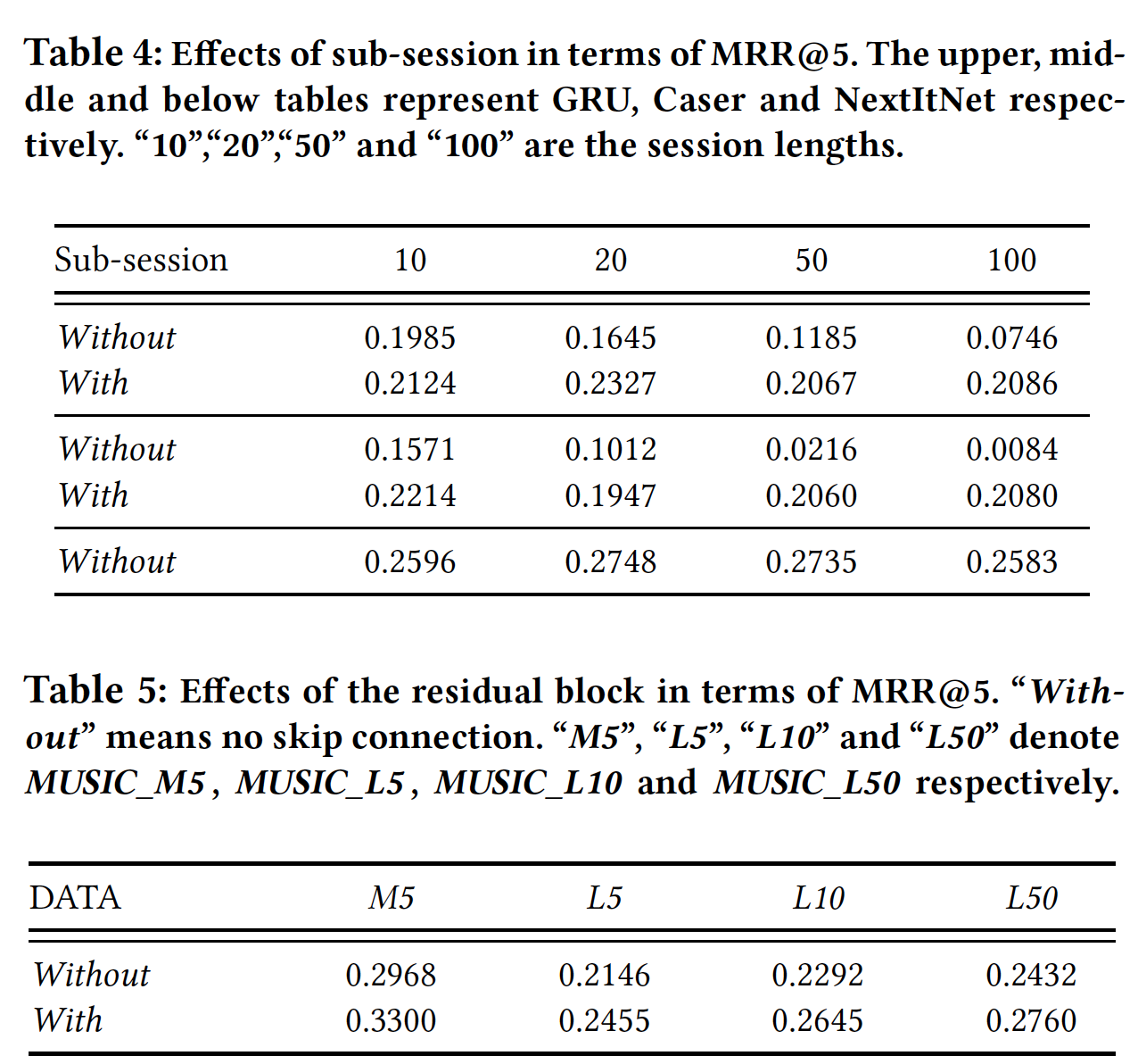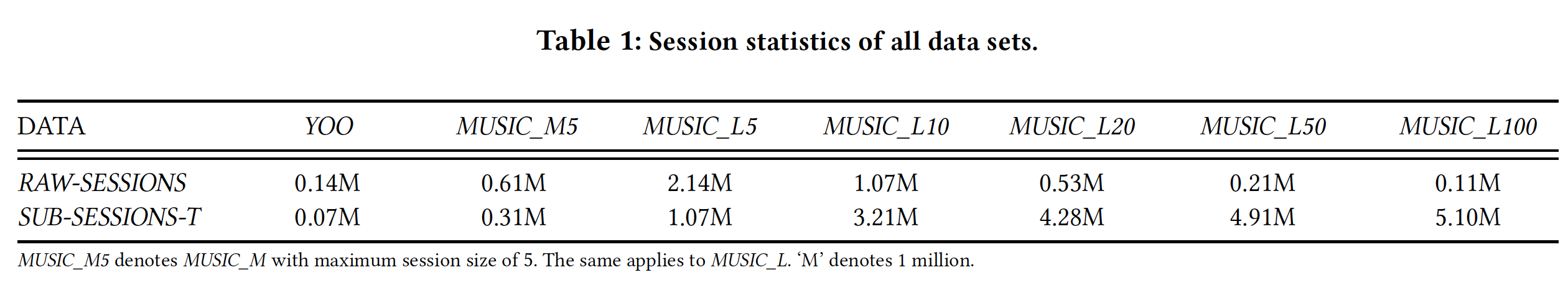 YOO, MUSIC_M5, MUSIC_L5,SUB-SESSIONS-T反而要比RAW-SESSIONS更少?读者猜测,这里SUB-SESSIONS-T不包含原始的RAW-SESSIONS,因此真实训练集是二者的并集。