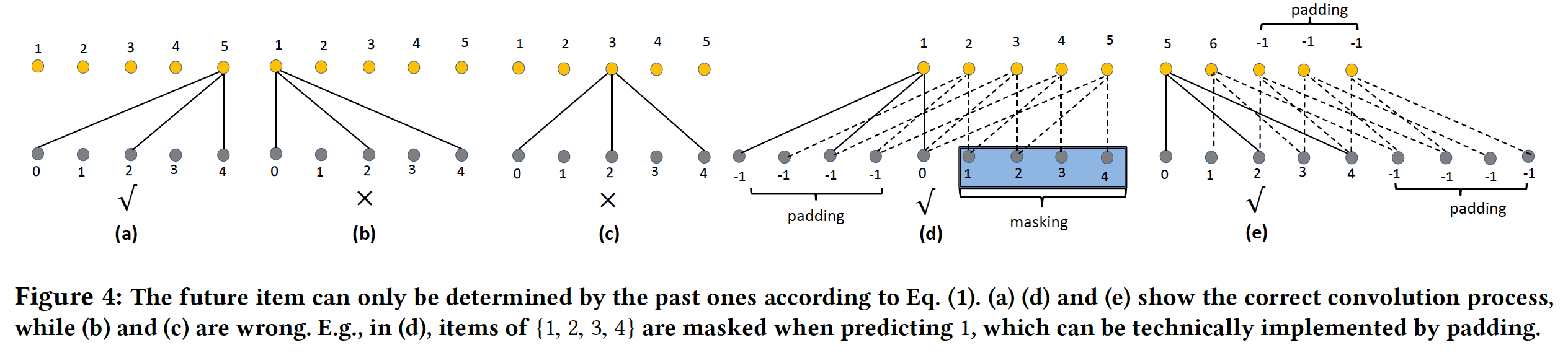 padding & masking:如图 (d) 所示,在输入序列左侧填充 CNN 的 padding 填充),并在卷积时 masking 卷积窗口右侧部分。