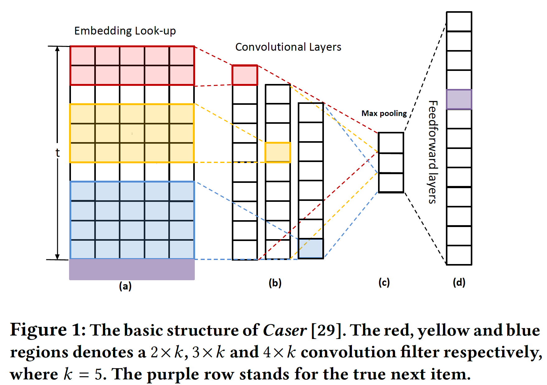 注意,与 Caser 在卷积期间将输入矩阵视为二维 image 不同,我们提出的架构通过一维卷积滤波器来学习 embedding layer ,我们将在后面描述。
