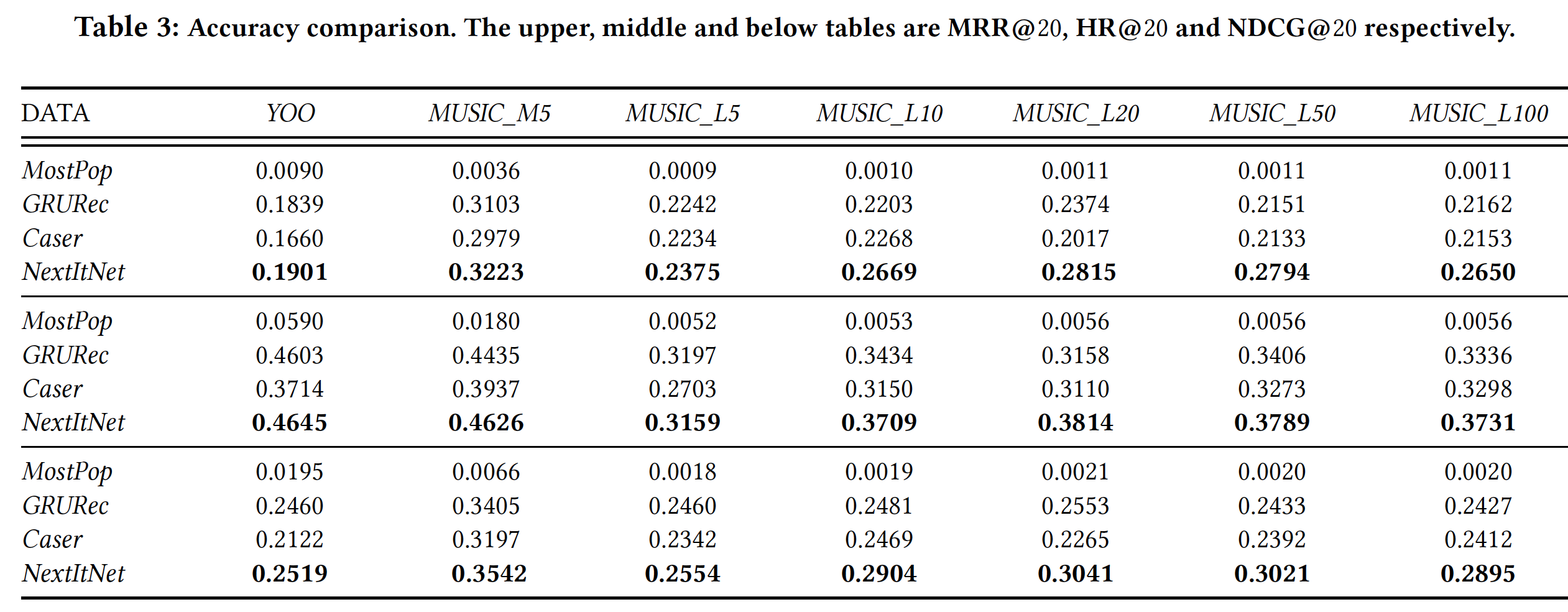 例如,在 MUSIC_M5 数据集中,三个神经网络模型在 MRR@5 上的表现比广泛使用的 baseline MostPop 好 120 倍以上。在这个数据集中,我们通过 NextItNet 获得的最佳 MRR@20 结果是 0.3223,这大致意味着目标 item 在 20000 个候选 item 中平均排名第 3 位(1/0.3223 大致等于 3 )