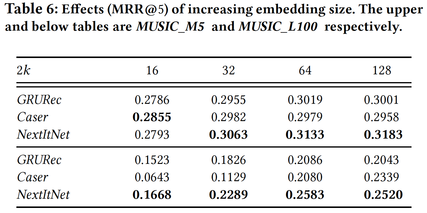 对于所有数据集,NextItNet 使用 0.001 的学习率和 batch size = 32 。