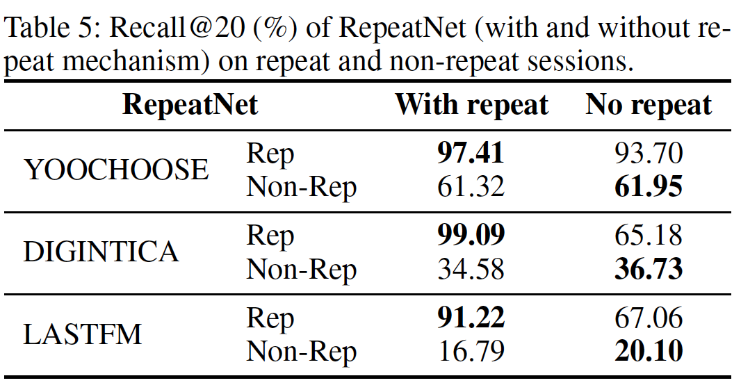 repeat mechanism 的分析:如上表所示,一般而言,RepeatNet with repeat 在所有数据集上都优于 RepeatNet without repeat 。