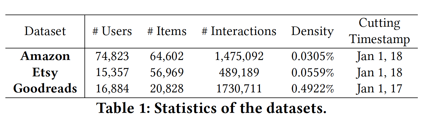 这个数据集要比 Amazon 和 Etsy 都更稠密,因为这样一个信息共享平台中的 item (即,书籍)更稳定,并且不太可能像电商平台中那样被新的 item 替换(如,商品可能被升级后的版本所替代)。