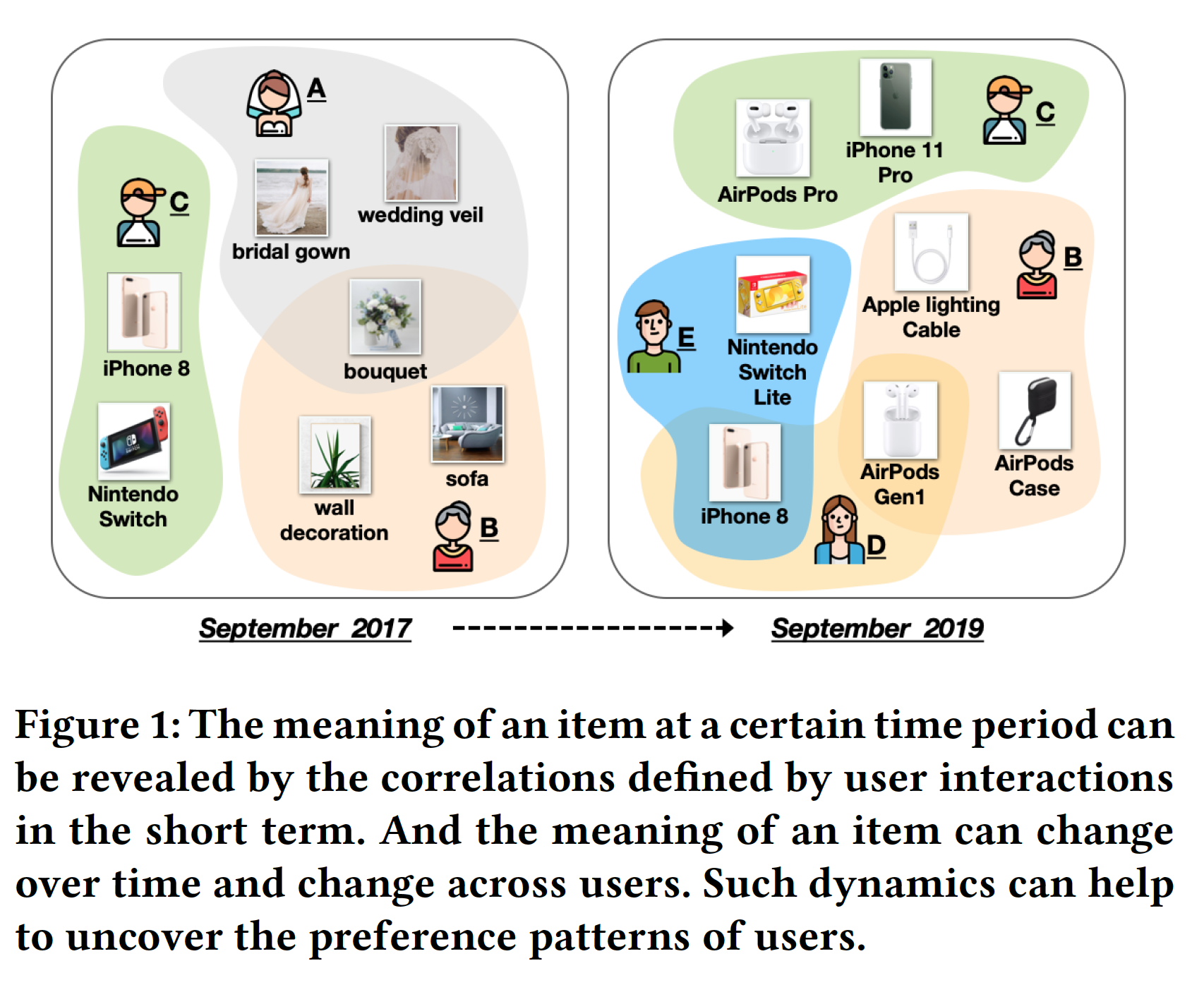 如上图所示,用户 C 在 2017 年购买 iPhone8 证明用户 C 追逐最新设备;而用户 D 在 2019 年购买 iPhone8 表明用户 D 追求性价比。尽管在这两种情况下的 item 是相同的,但是 iPhone8 的基本语义已经发生改变。