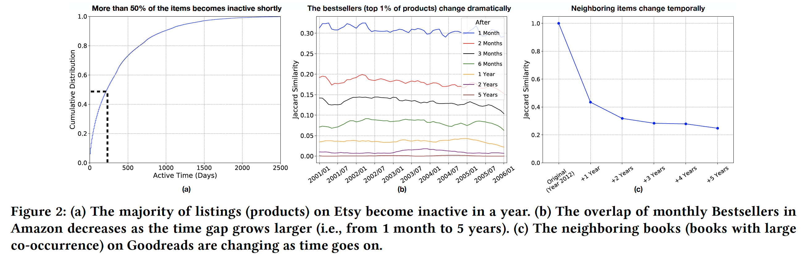 Motivation:这里我们对来自三个在线平台(Amazon, Etsy, Goodreads )的数据进行初步调研。我们同时从长期和短期的角度探讨 item 的动态模式(dynamic pattern)以及 item 之间的相关性。