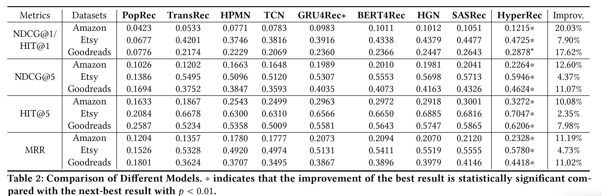 实验结果:我们将 HyperRec 与 baseline 进行比较,结果如下表所示。可以看到: