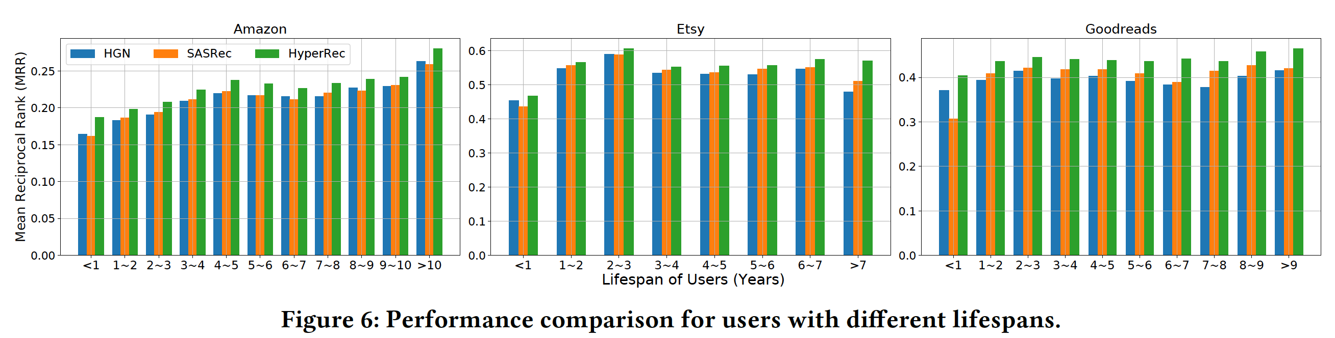 我们发现 HyperRec 显著优于所有生命周期的 baseline 。对于生命周期较长的用户,HyperRec 可以实现较大的提升,这表明 HyperRec 在捕获长期用户模式并同时考虑短期相关性方面具有优势。