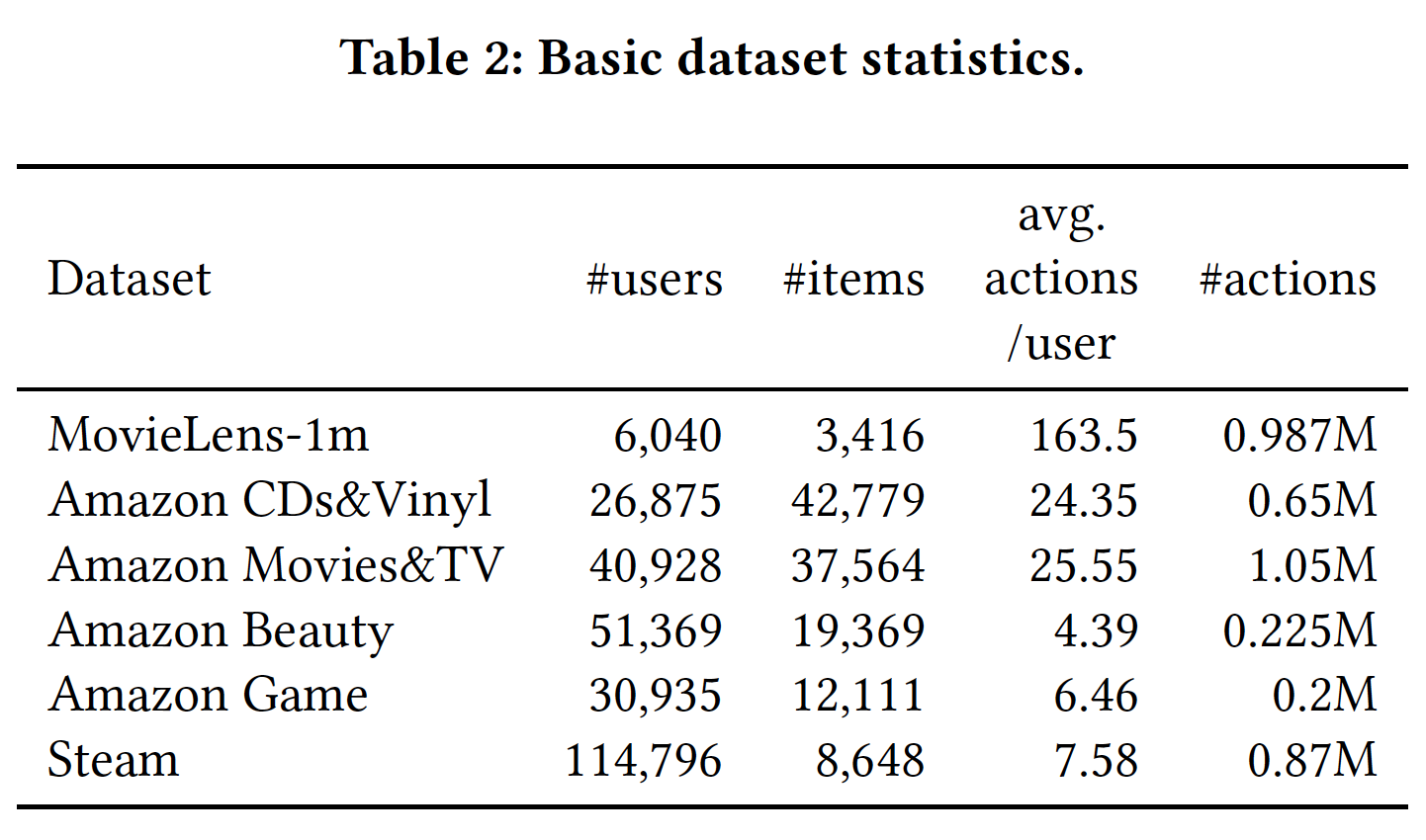 数据集的统计结果如下表所示。MovieLens-1m 是最稠密的数据集,具有最长的平均 action 和最少的用户和最少的 item 。Amazon Beauty 和 Amazon Games 具有最短的平均 action 。