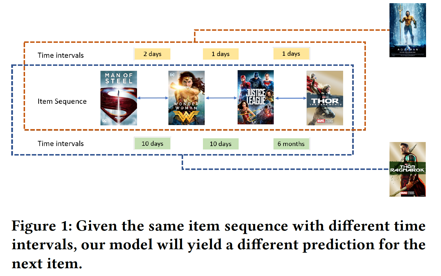 可视化:我们使用 TiSASRec 来预测用户可能交互的 next item。然后,我们将所有时间间隔设为相同从而获得另一个预测。如下图所示,可以看到时间间隔影响了预测结果。