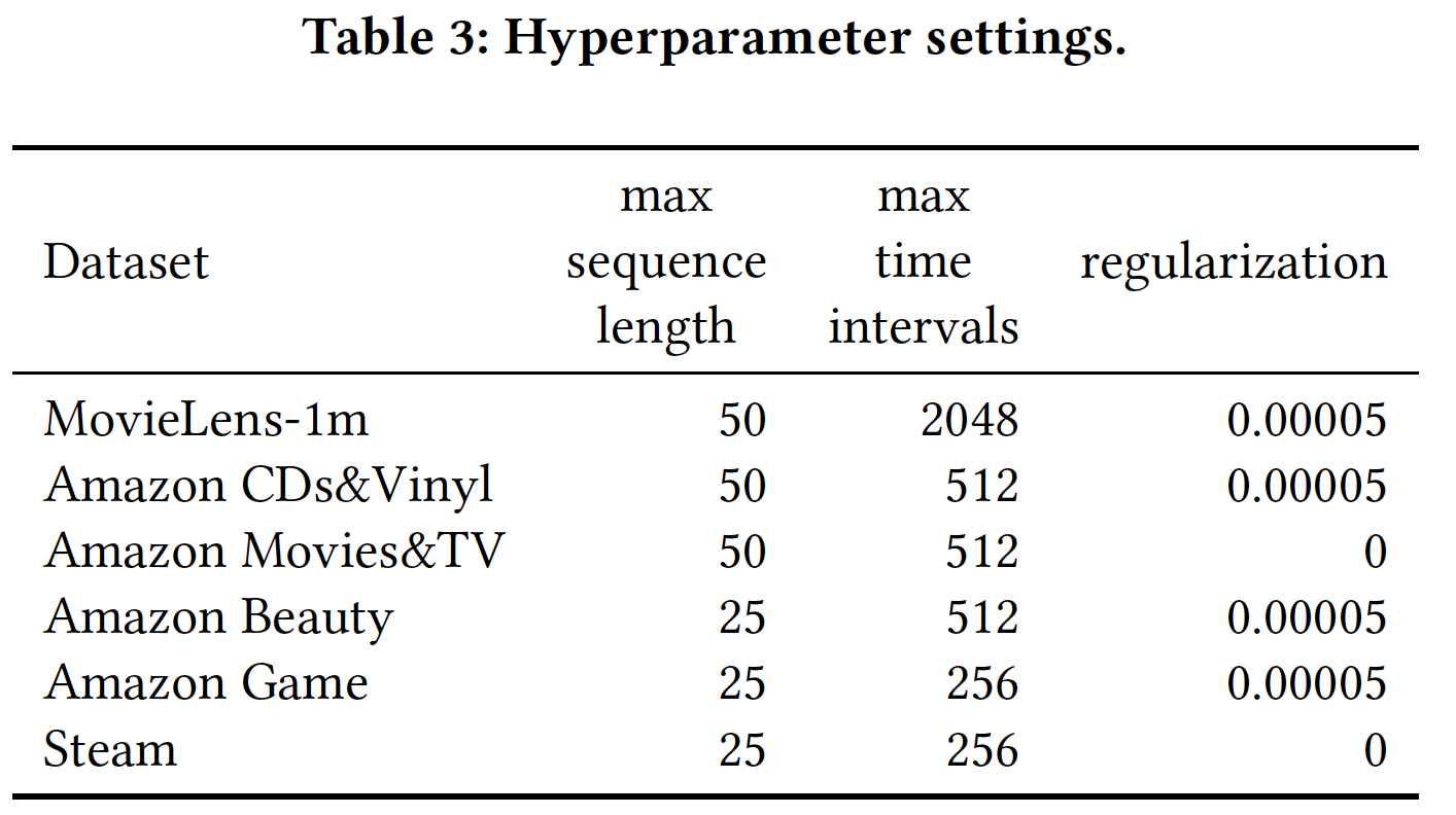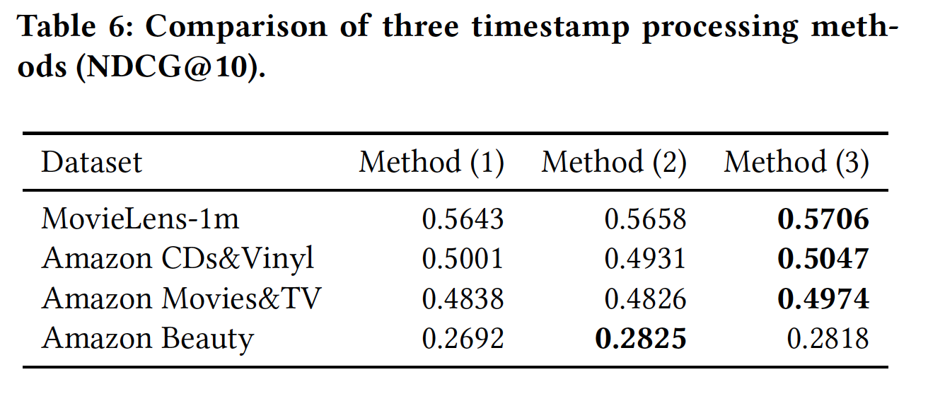 下表给出了时间戳不同处理方法的结果。注意,我们不会在前两种方法中裁剪时间戳。可以看到:第三种方法(即,个性化的时间间隔)在前三个数据集中获得了最佳性能。