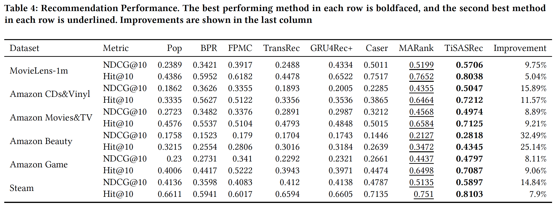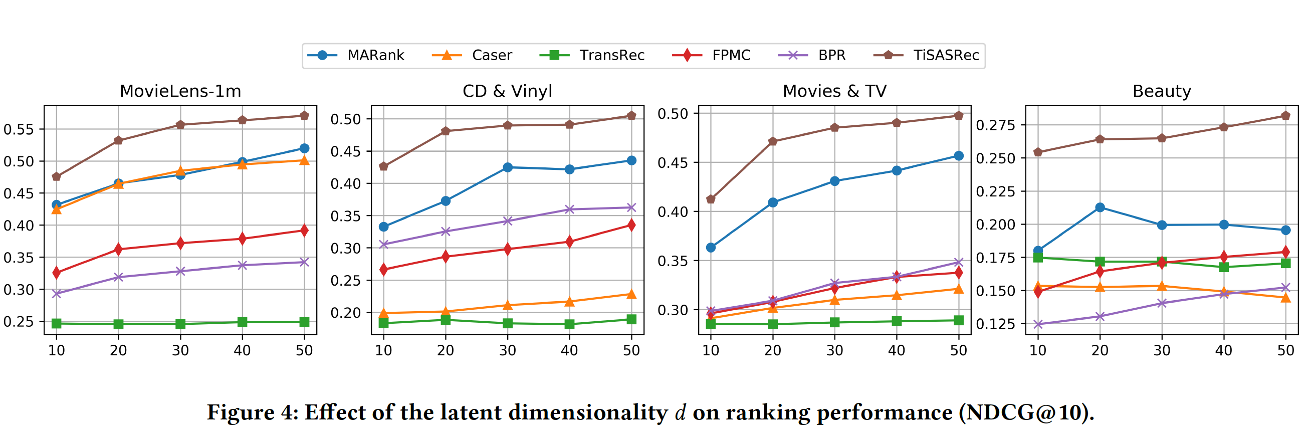 对于数据集Amazon Beauty,当 Caser, MARank, TransRec 的性能较差。