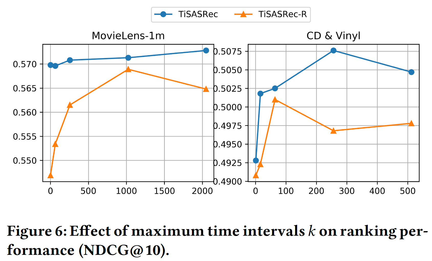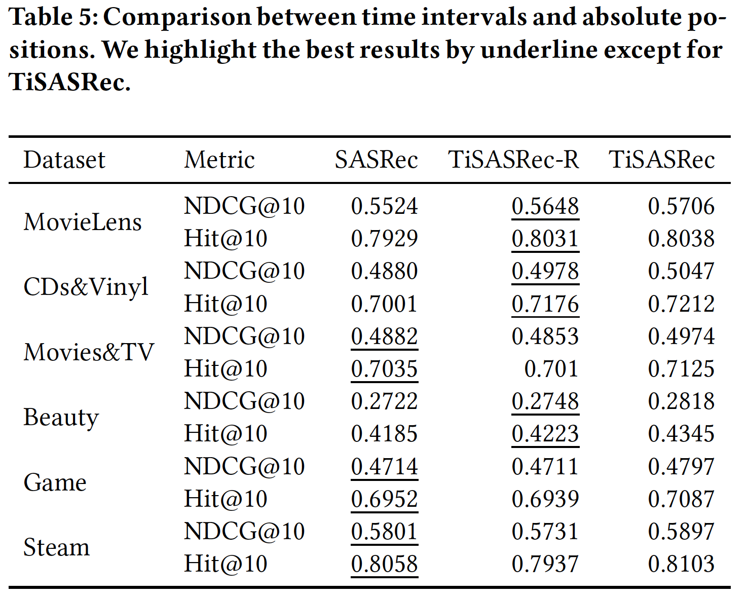 总体而言,TiSASRec-R (仅使用相对时间间隔)将具有与 SASRec (仅使用绝对位置)相似的性能。