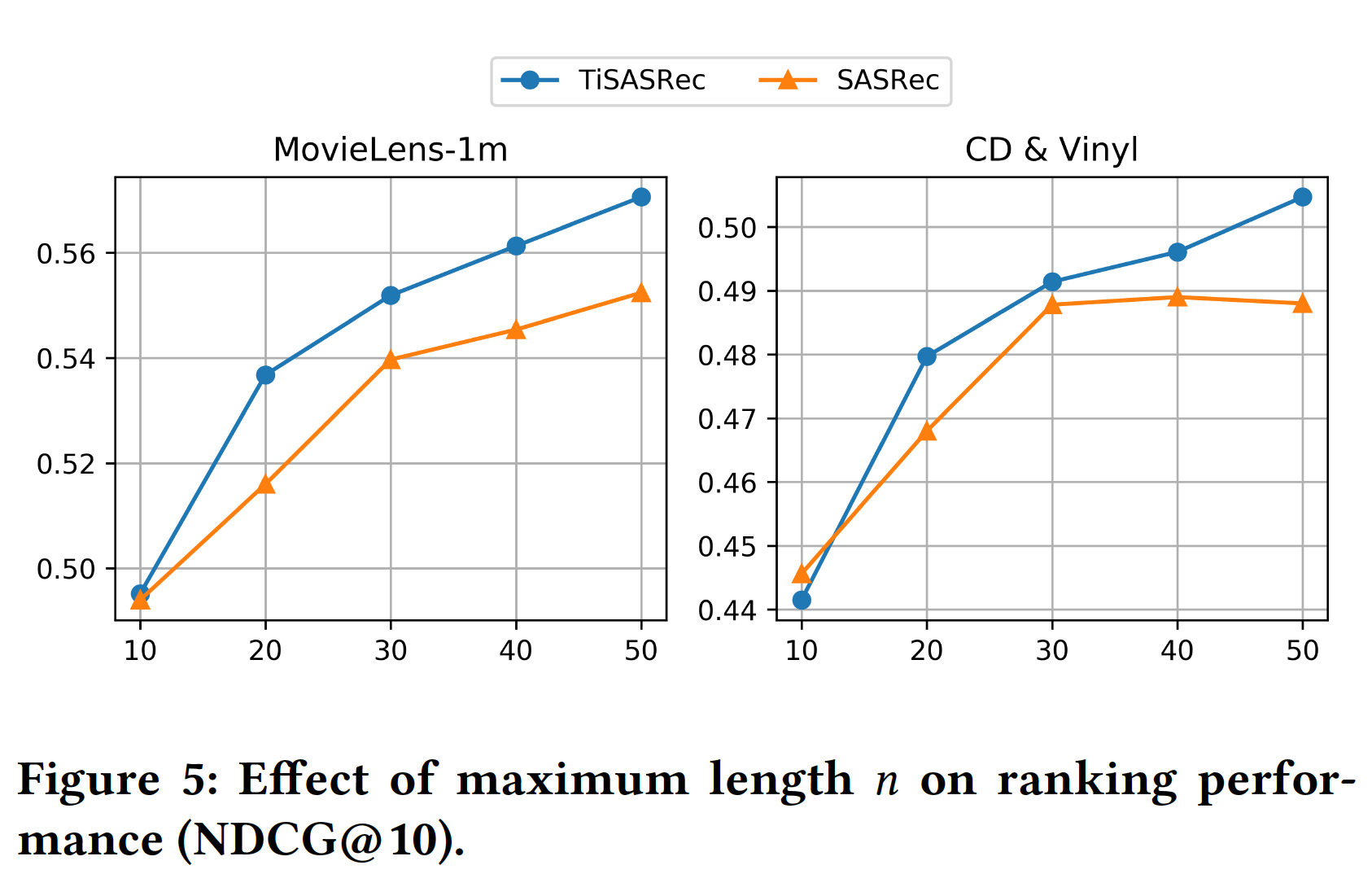 最大序列长度 10 到 50 对 NDCG 指标的影响。可以看到:更大的