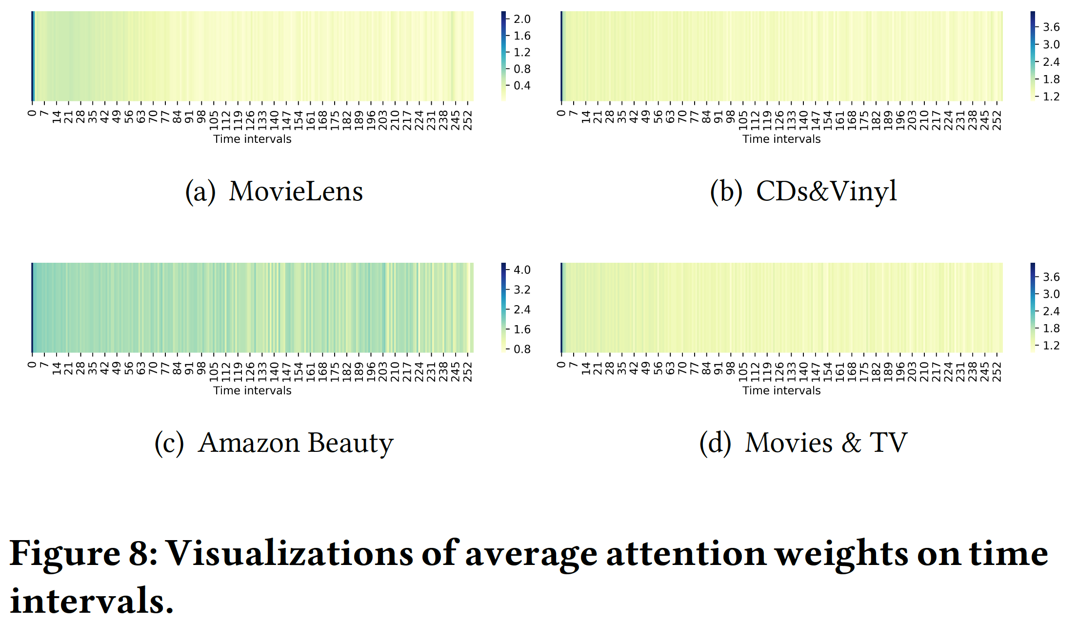 下图展示了前 256 个时间间隔的平均注意力权重 padding item 的影响。从这四个热力图中我们可以看到: