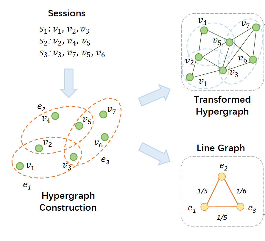 将 session 数据转换为超图之后,session 中的任意两个 item 都将被连接起来。