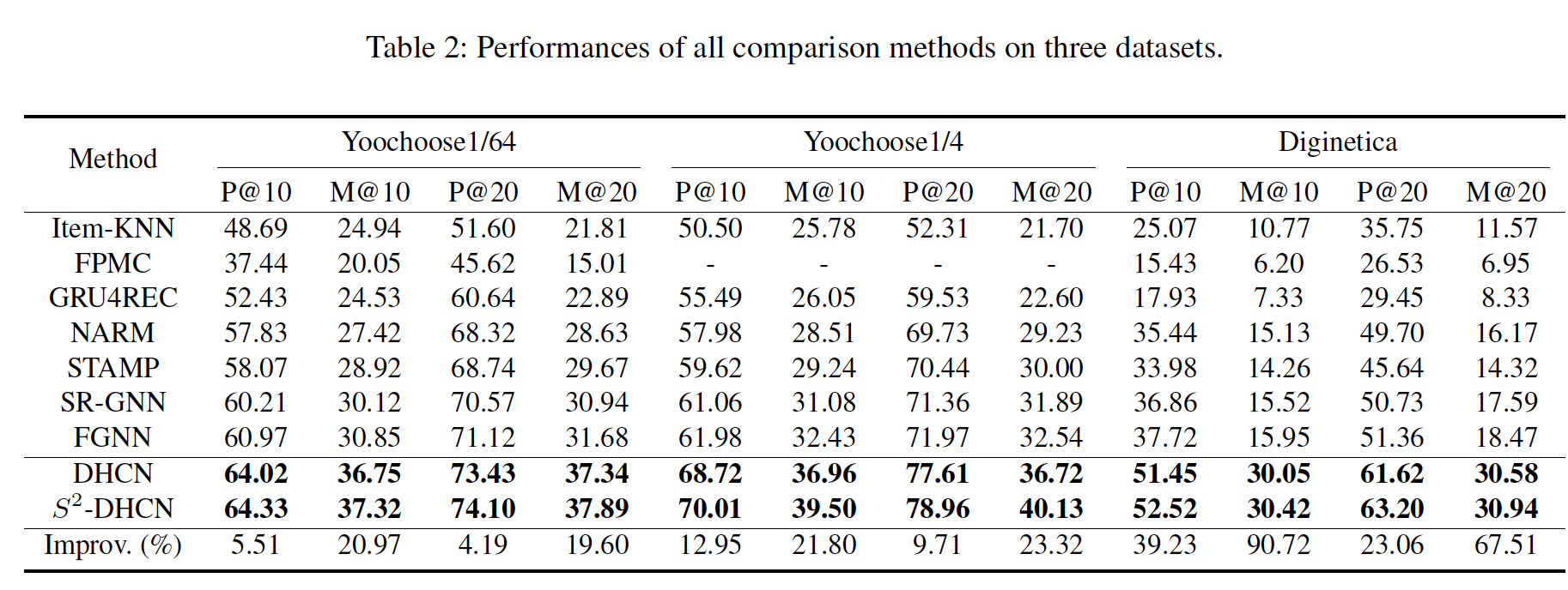 GNNs-based 模型:SR-GNN 和 FGNN 优于 RNN-based 模型。这些改进可以归因于 GNN 的巨大容量。但是,与 DHCN 带来的改进相比,这些改进是微不足道的。