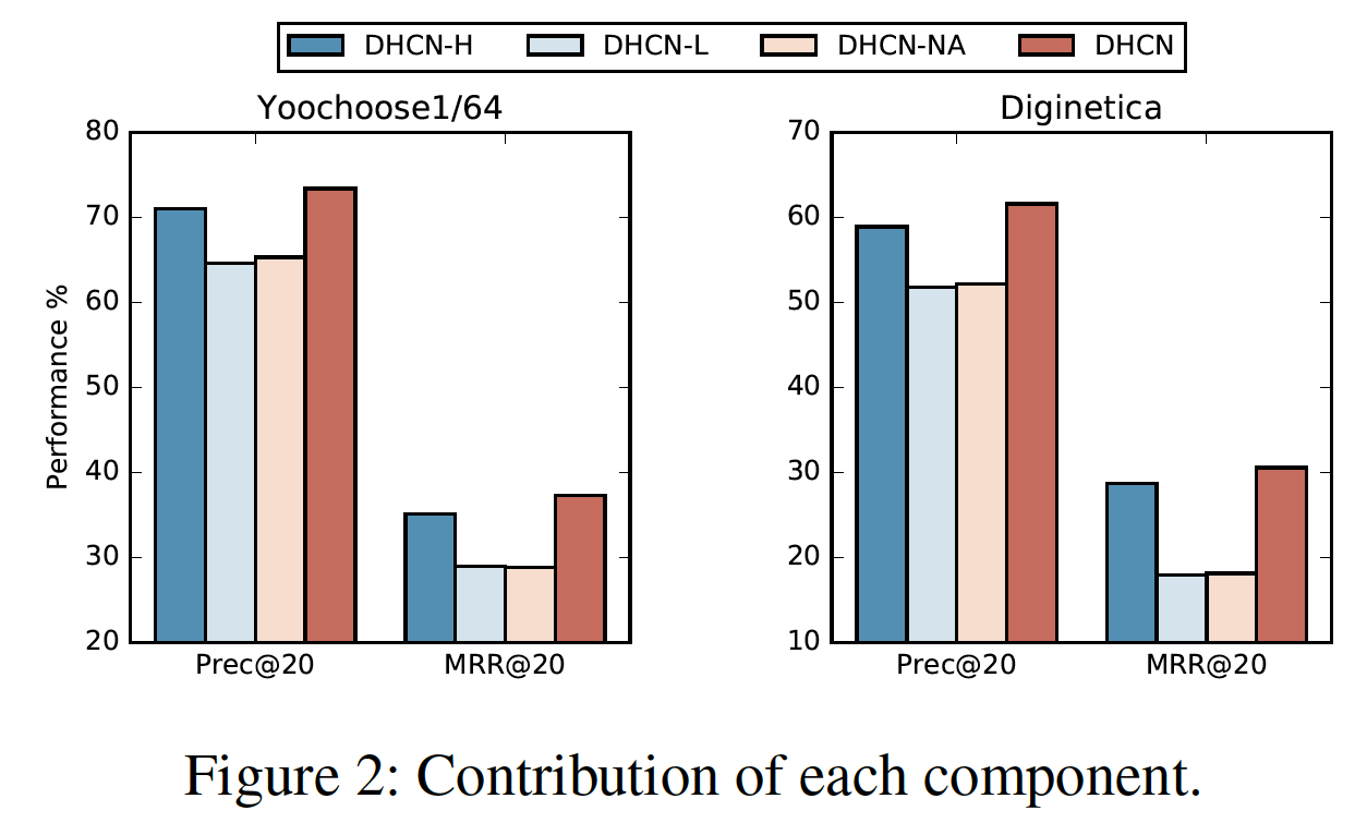 此外,需要注意的是,MRR 的改进比 Precision 的改进更为显著,这意味着 DHCN 不仅可以成功命中 groud-truth item,而且在 top-K 推荐列表中的排名也大大提升。