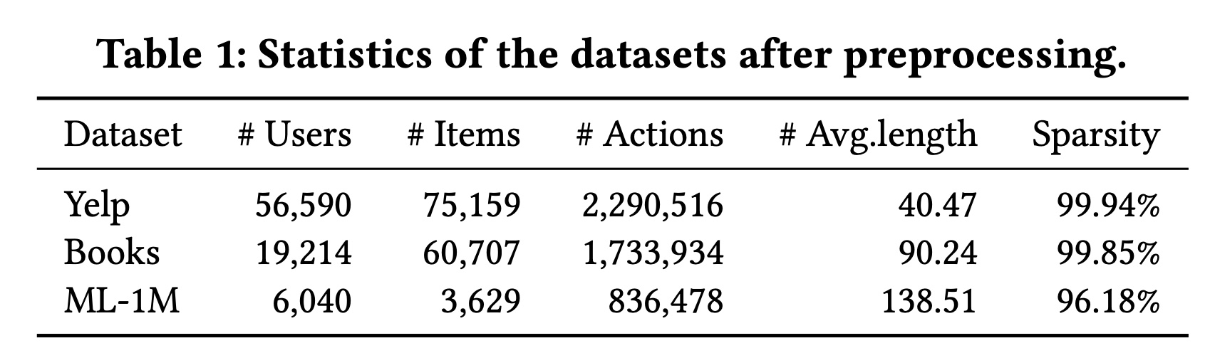 数据集和评估方式:我们使用了三个真实世界的基准数据集,包括Yelp 、Amazon Books 和 ML-1M ,其统计信息如 Table 1 所示。遵循先前的工作,我们采用留一法(leave-one-out )进行评估,并使用 HIT@K 和 NDCG@K 来评估性能。