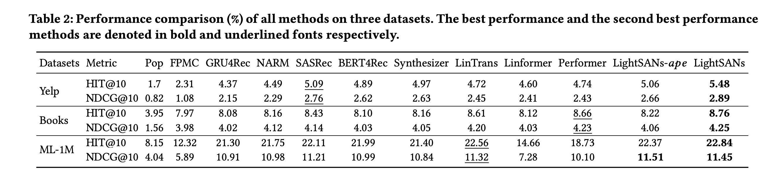 在三个基准推荐数据集上进行了广泛的实验,LightSAN 在有效性和效率方面均优于各种 SANs-based 的方法。