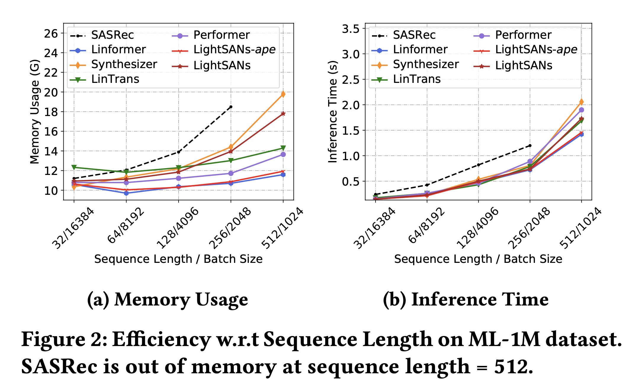 此外,我们绘制了 LightSANs 和其他 SANs-based 的方法在固定 items 总数的情况下,内存使用和推理时间随序列长度的变化情况(均在 Tesla P40 GPU 上进行测试)。如 Figure 2 所示: