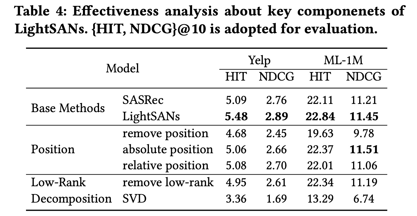 我们对 LightSANs 中关键设计进行了有效性分析,结果如 Table 4 所示。