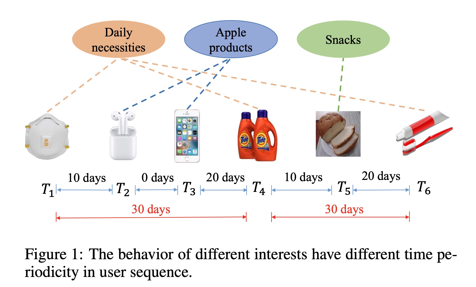 (1):它们仅使用时间信息对 items 进行排序,而忽略了 behaviors of different interests 在用户序列中具有不同的时间周期。例如,在 Figure 1 中,给定一个用户的行为序列,用户可能对日用品(daily necessities )、苹果的产品、以及零食(snacks )感兴趣。他/她可能每个月都会购买日用品,但他/她只在苹果新产品发布期间关注苹果产品。因此,对日用品感兴趣的时间间隔约为一个月,而对苹果产品感兴趣的时间间隔更长,约为一年。综上所述,用户对不同类型 items 的行为有不同的周期性。