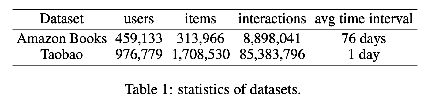 Taobao 数据集:包含 1 million users 的交互行为,包括点击、购买、加入购物车和收藏商品。我们使用 Taobao 数据集中的用户点击行为进行实验。