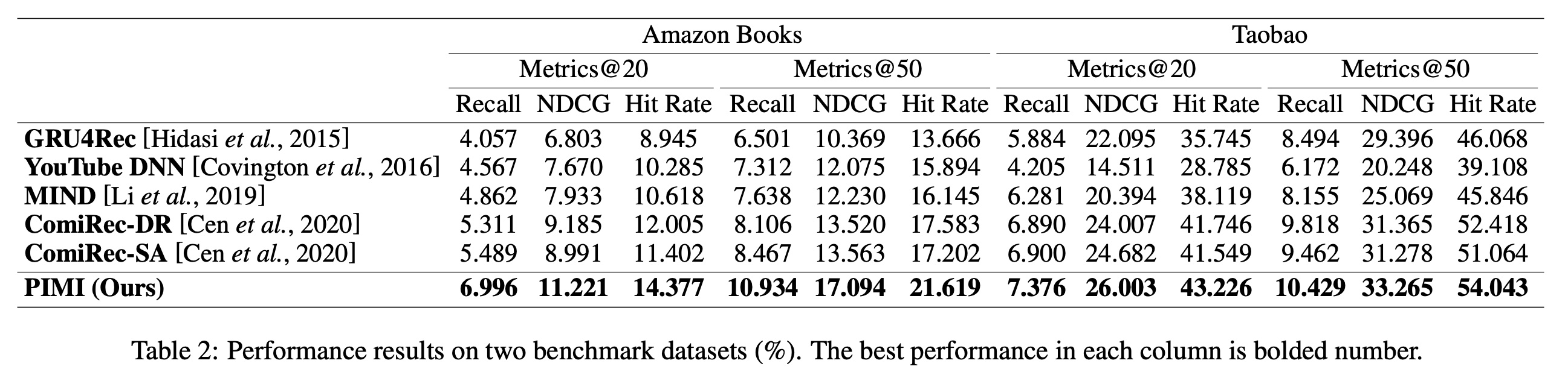 为了证明我们的模型 PIMI 的序列推荐性能,我们将其与其他 SOTA 的方法进行了比较。Table 2 列出了所有方法在 Amazon 数据集和 Taobao 数据集上的实验结果,我们得到以下观察结果。