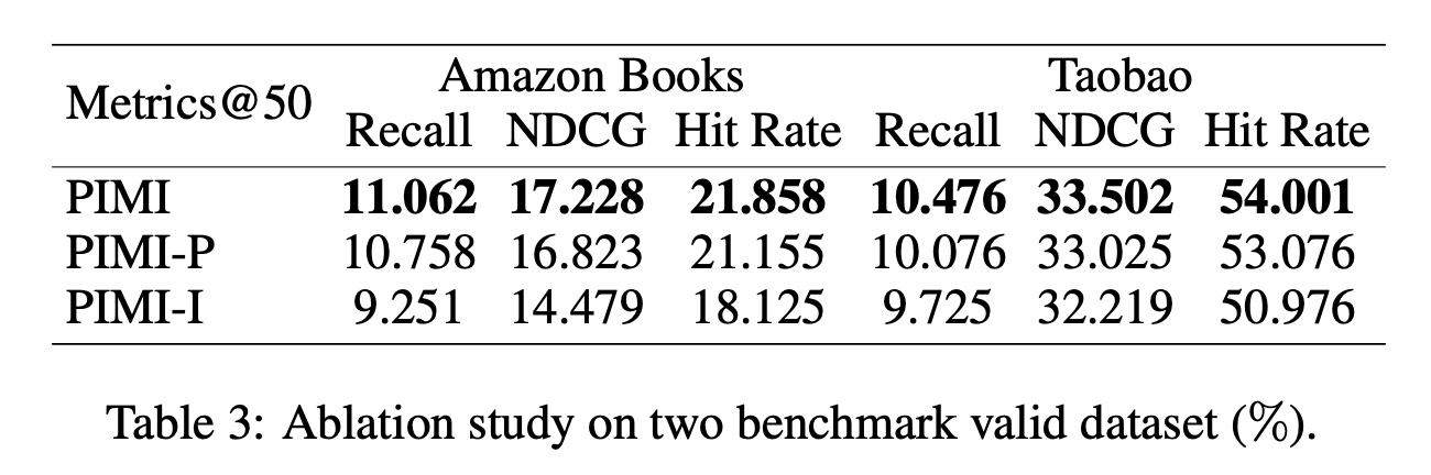 我们在 Table 3 展示了 PIMI、PIMI-P 和 PIMI-I 在 Amazon 验证集和 Taobao 验证集上的实验结果。根据实验结果,我们得出以下观察结果: