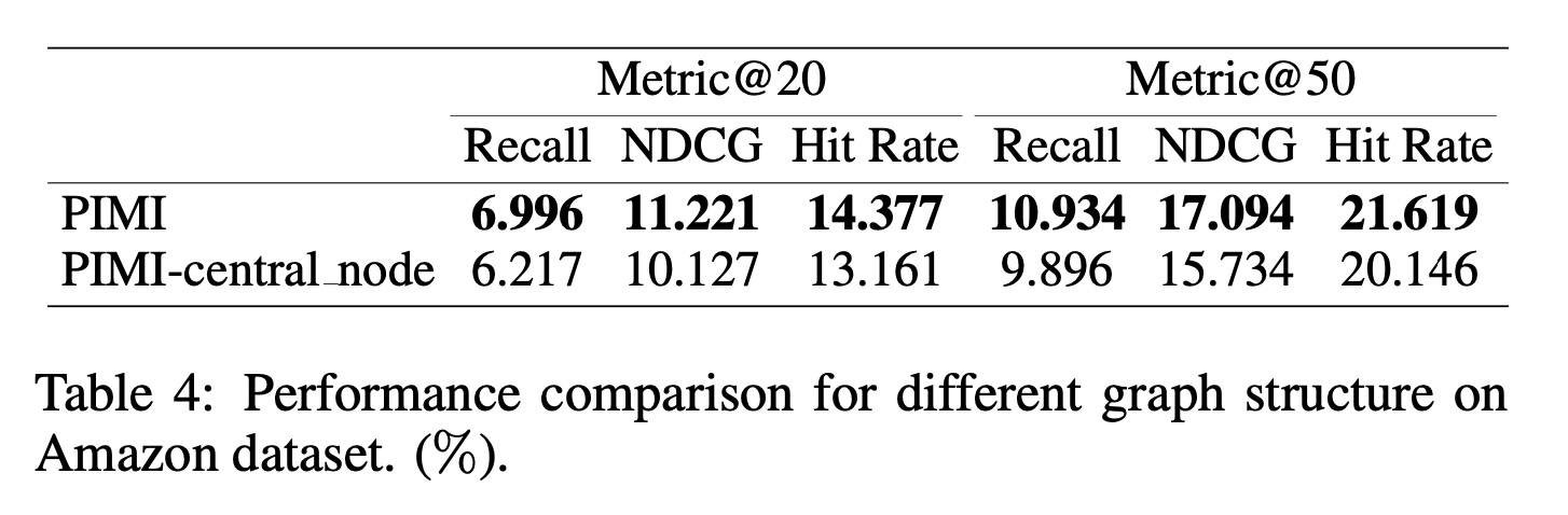 virtual central node 的影响:为了证明我们的 graph 结构在解决序列推荐中 items 之间的交互性方面非常有效,我们进行了一个实验来比较 PIMI 和 PIMI-central_node 。对于模型变体 PIMI-central_node ,我们删除了 graph 结构中的 virtual central node ,只对序列中相邻 items 之间的 correlation 进行建模。