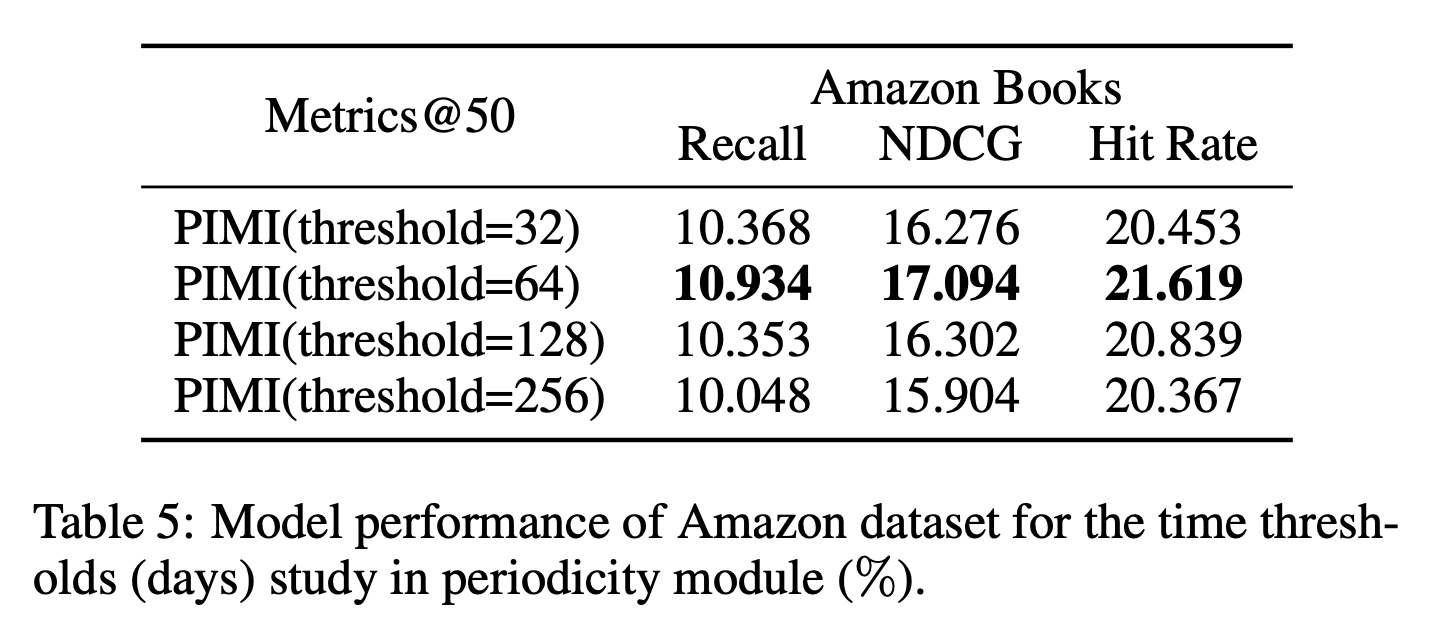 对于模型变体 PIMI-I ,我们删除了 interactivity module ,只在 periodicity module 中引入了时间间隔信息。