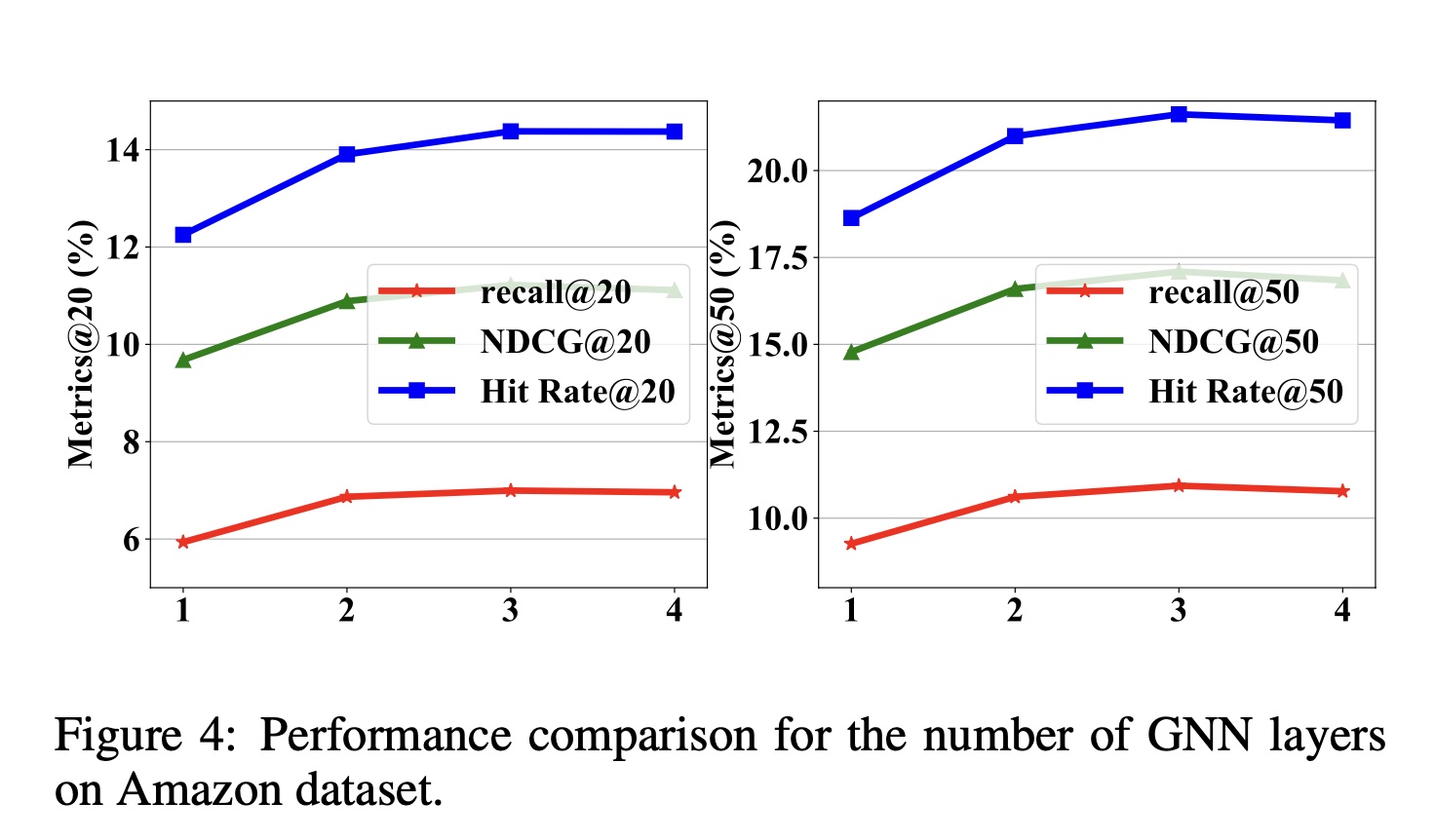 GNN layers 数量的影响:Figure 4 展示了在 Amazon 数据集上不同 GNN 层数的性能对比。实验结果表明:
