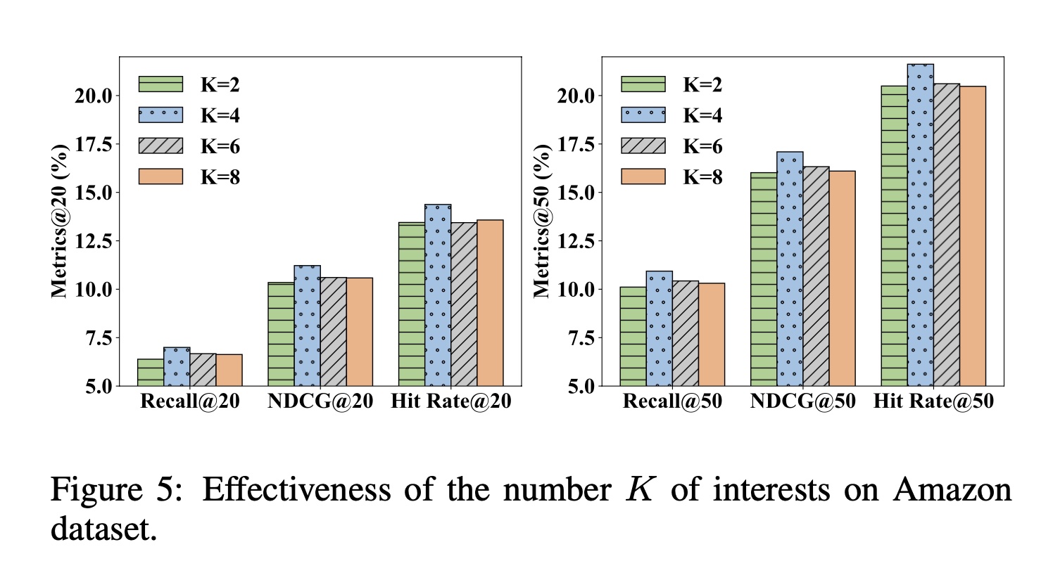 兴趣数量 Figure 5 显示了在 Amazon 数据集上兴趣数量 Metrics@20 和 Metrics@50 的影响。对于 Amazon 数据集,当 PIMI 获得更好的性能。在现实世界中,每个用户的兴趣数量通常不会太多或太少。因此,设置太小或太大的兴趣数量都无法反映用户的真实情况。