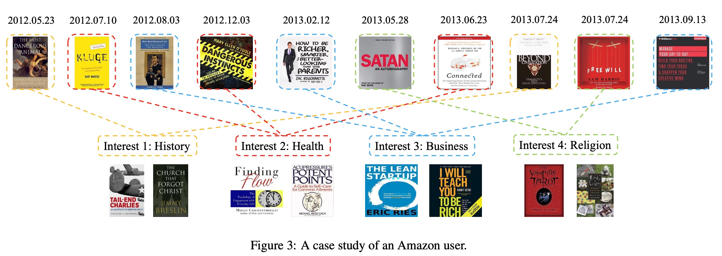 案例研究:如 Figure 3 所示,在 Amazon 数据集中,我们随机选择一个用户并从用户的行为序列中生成四个 interest embedding 。我们发现用户的四个兴趣是关于历史(history)、健康(health)、商业(business)和宗教(religion)。我们观察到:用户对健康书籍的阅读周期约为五个月,而用户对商业书籍的阅读周期约为半年。这表明我们提出的 PIMI 可以成功捕获这些周期性信息,从而有助于更好地表示兴趣。