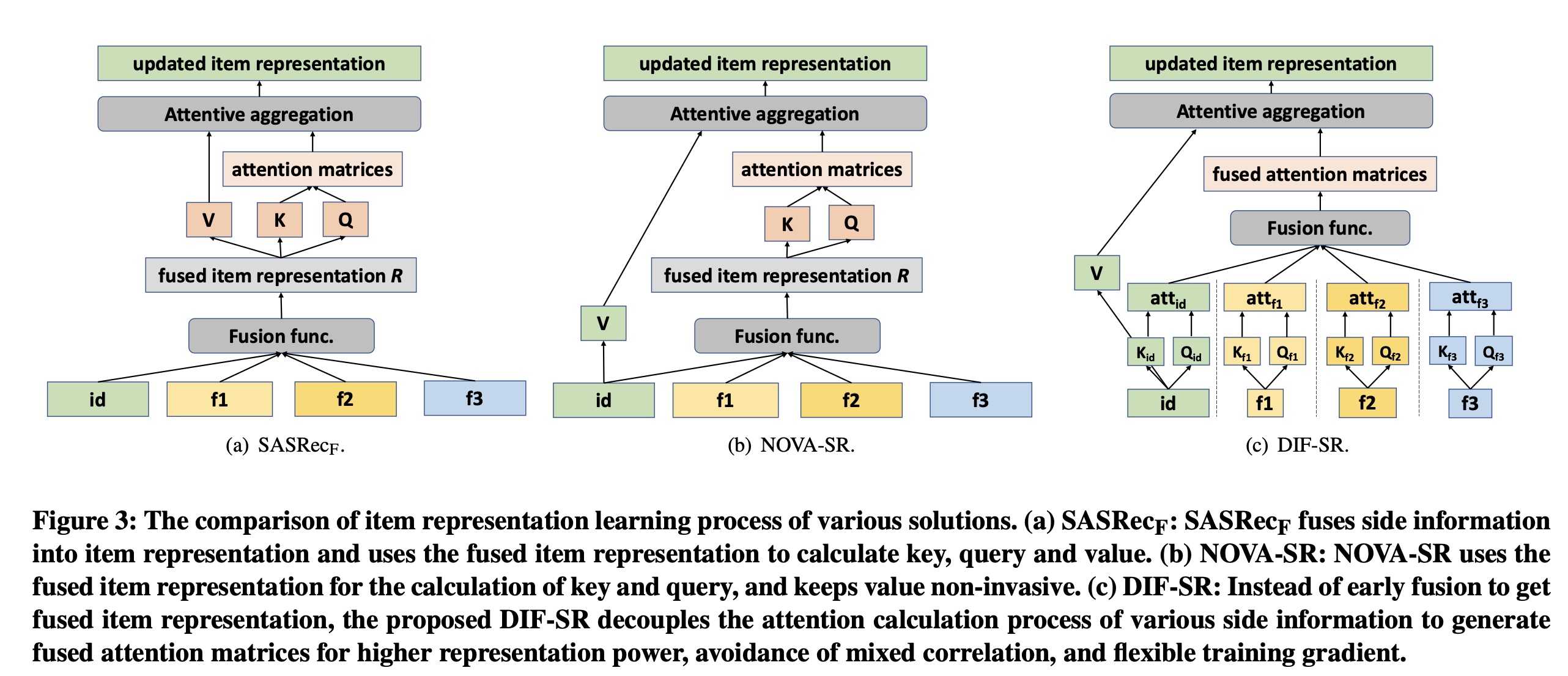 NOVA 提出将 pure item id representation 和 side information integrated representation 都输入到 attention layer ,其中后者仅用于计算注意力的 key 和 query,而保持 value 不变。