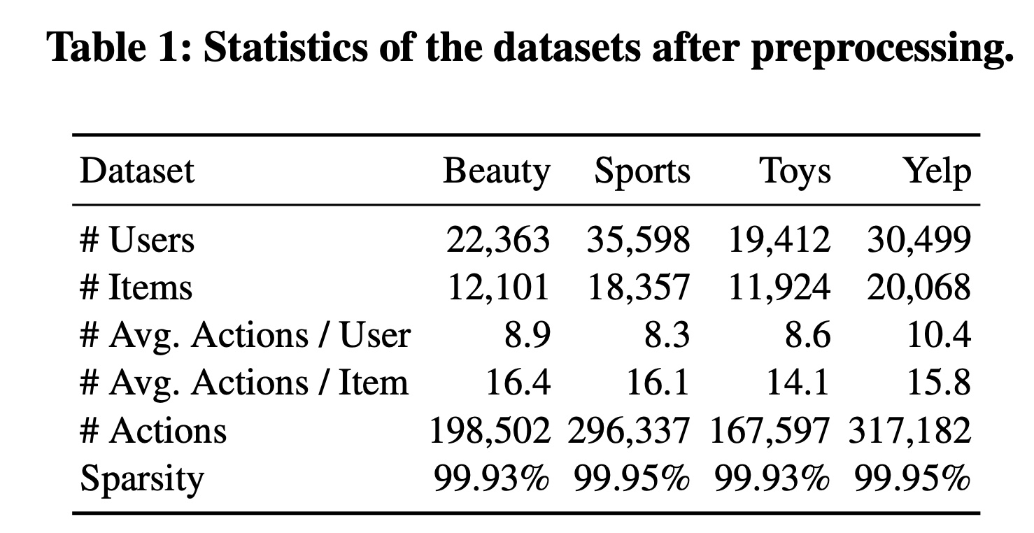 遵循文献 《Self-attentive sequential recommendation》 、《ICAI-SR: Item Categorical Attribute Integrated Sequential Recommendation》、《S3-rec: Self-supervised learning for sequential recommendation with mutual information maximization》 中使用的相同预处理步骤,我们删除了在这些数据集中出现次数少于 5 次的所有 items 和用户。所有交互都被视为隐式反馈。预处理后这四个数据集的统计信息总结在 Table 1 中。
