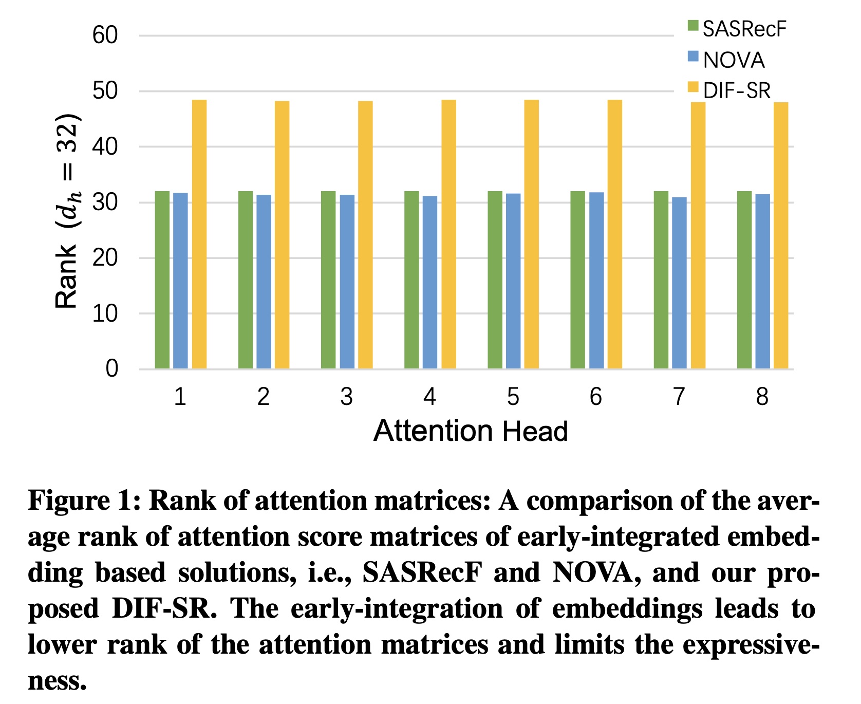 备注:该定理表明,辅助信息的 early fusion 将注意力矩阵的 rank 限制在 item 和 attributes 的 decoupled attention score ,打破了这种 rank bottleneck 。Figure 1 也给出了 rank comparison 的实验的结果。更高 rank 的注意力矩阵本质上增强了 DIF-SR 的模型表达能力。