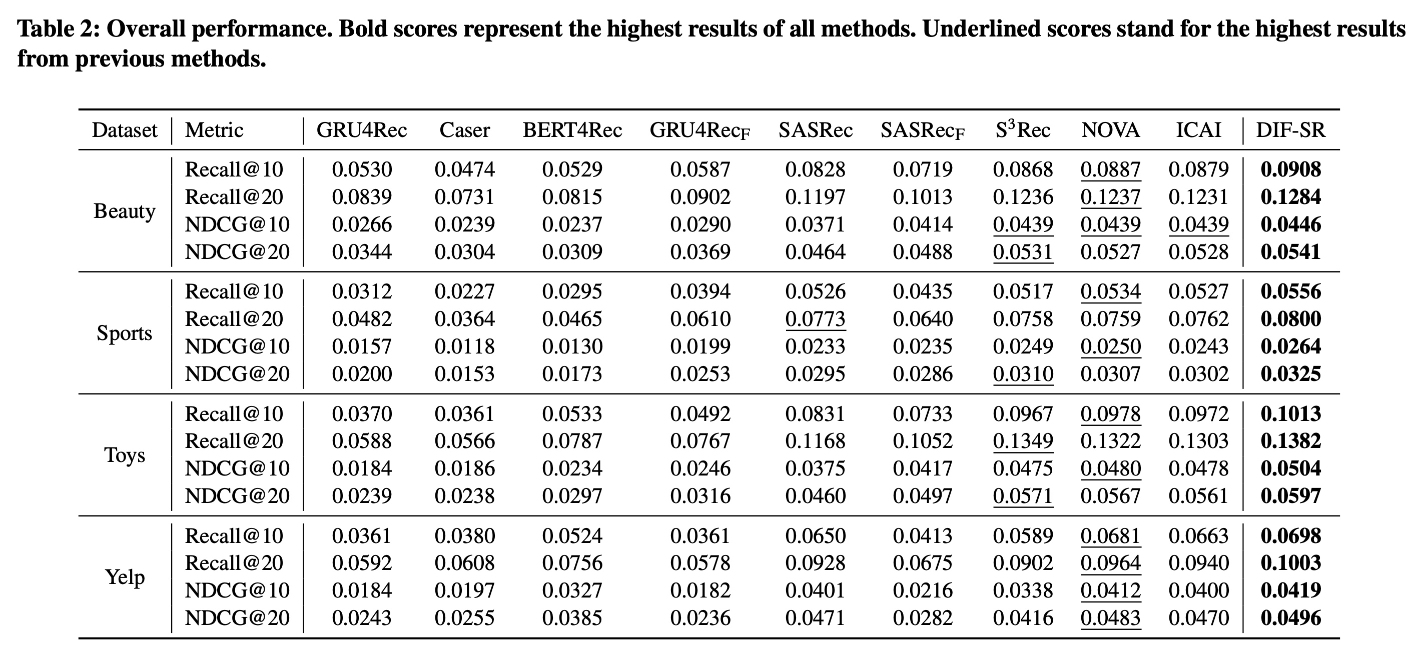 (DIF-SR w/o DIF):不带 DIF 的 DIF-SR ,采用与 SASRec_F 相同的 early fusion ,并保持包括 AAP 在内的其他设置与原始模型相同。